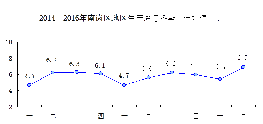 据初步核算,2016年上半年,南岗区实现地区生产总值(GDP)472.6亿元,同比增长6.9%(按可比价格计算,下同)。总量占全市的19.6%,占九区的25.3%;增速低于全市0.2个百分点。